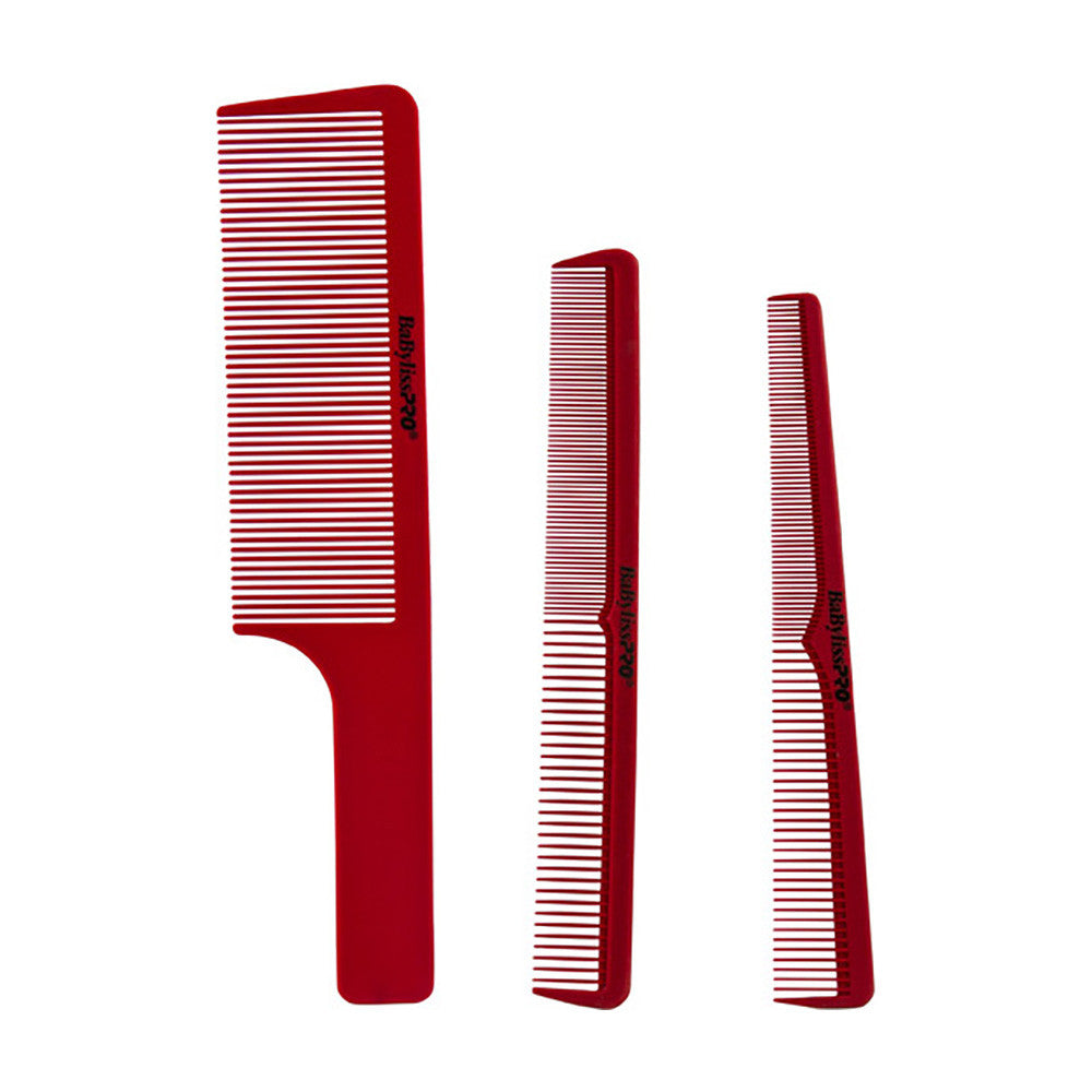 BaBylissPRO Barberology Barbers Comb Set is a three-piece set of barbering essentials. The set includes 22cm clipper comb, 19cm cutting comb and 19.5cm taper comb. With signature red colour, the combs create a visual contrast against all hair colours, assisting in more precise cutting, blending and fading. Made from fibre and nylon for flexible strength. Heat and chemical resistant.